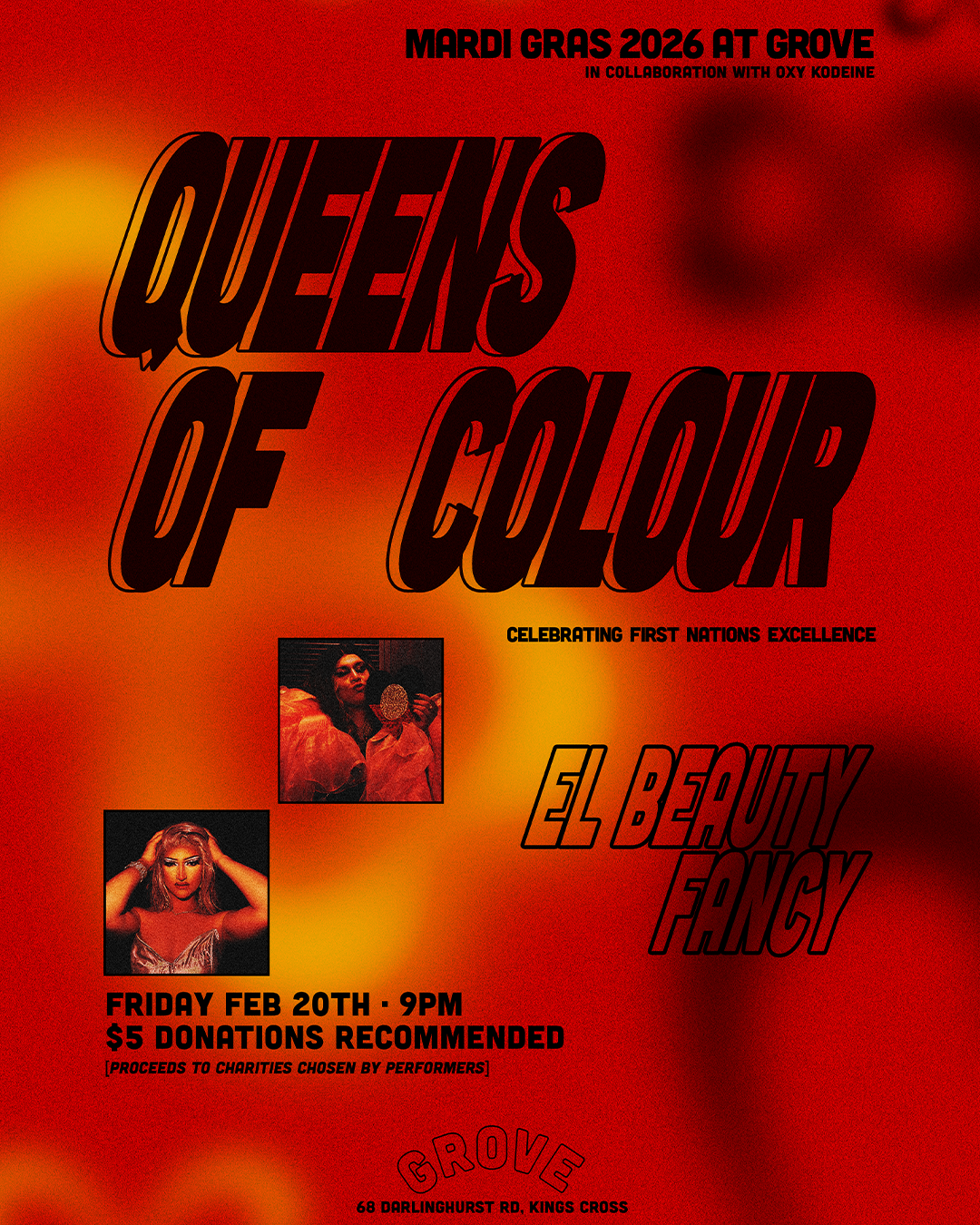 With her passion for country and expanding First Nations representation through the queer creative performance space, we're honoured to have Wiradjuri Queen, Oxy Kodeine collabing with Grove as event curator for Q.O.C. Mardi Gras 26! Oxy was nurtured through 'Haus of Kong' as the drag daughter of our famously loved RPDR's Kween Kong. Through passion and diligence, Oxy has established herself as a fierce performer across stages in every city she visits, including proudly holding tittles of: