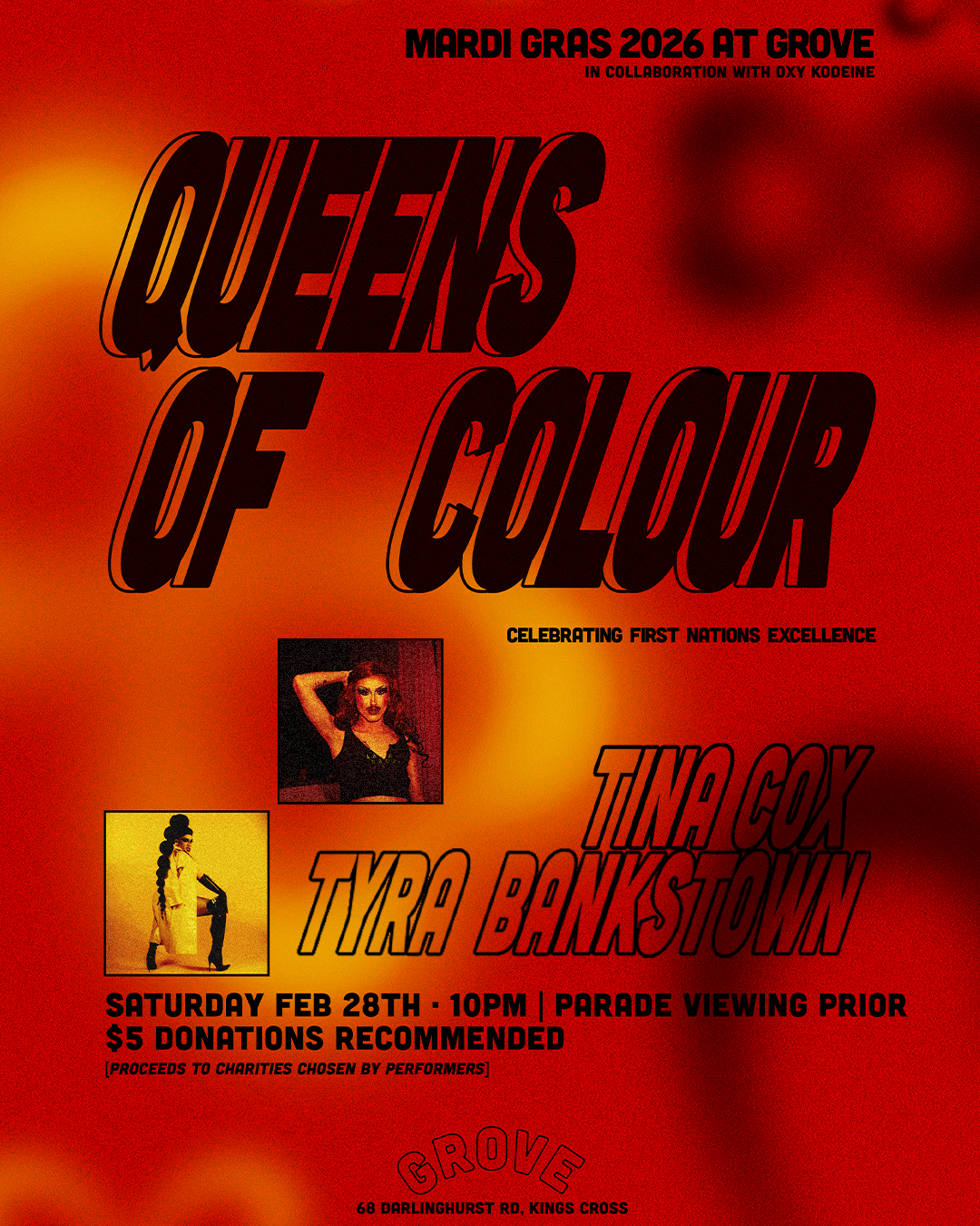 With her passion for country and expanding First Nations representation through the queer creative performance space, we're honoured to have Wiradjuri Queen, Oxy Kodeine collabing with Grove as event curator for Q.O.C. Mardi Gras 26! Oxy was nurtured through 'Haus of Kong' as the drag daughter of our famously loved RPDR's Kween Kong. Through passion and diligence, Oxy has established herself as a fierce performer across stages in every city she visits, including proudly holding tittles of: